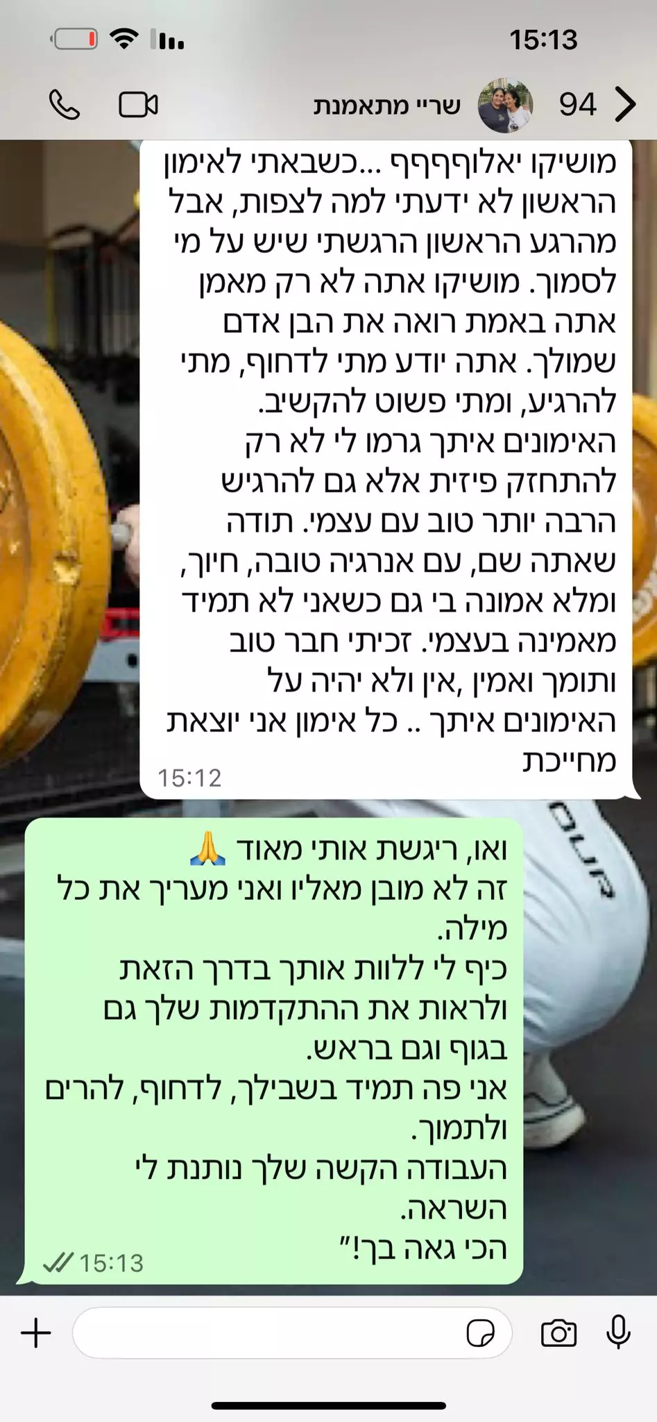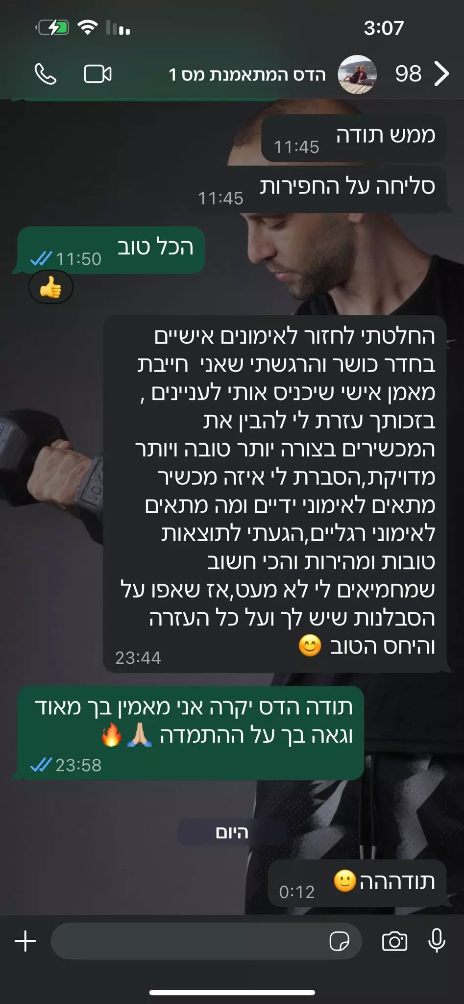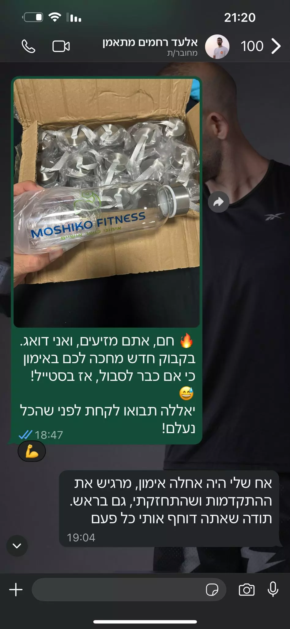 שלום, שמי משה ג׳רבי ואני מאמן כושר אישי עם ניסיון של מספר שנים בתחום הכושר והבריאות. במהלך השנים עזרתי להרבה אנשים, נשים וגברים כאחד, להשיג את המטרות שלהם – בין אם זה לרדת במשקל, להתחטב, לשפר את הכושר הגופני או לעלות מסת שריר.