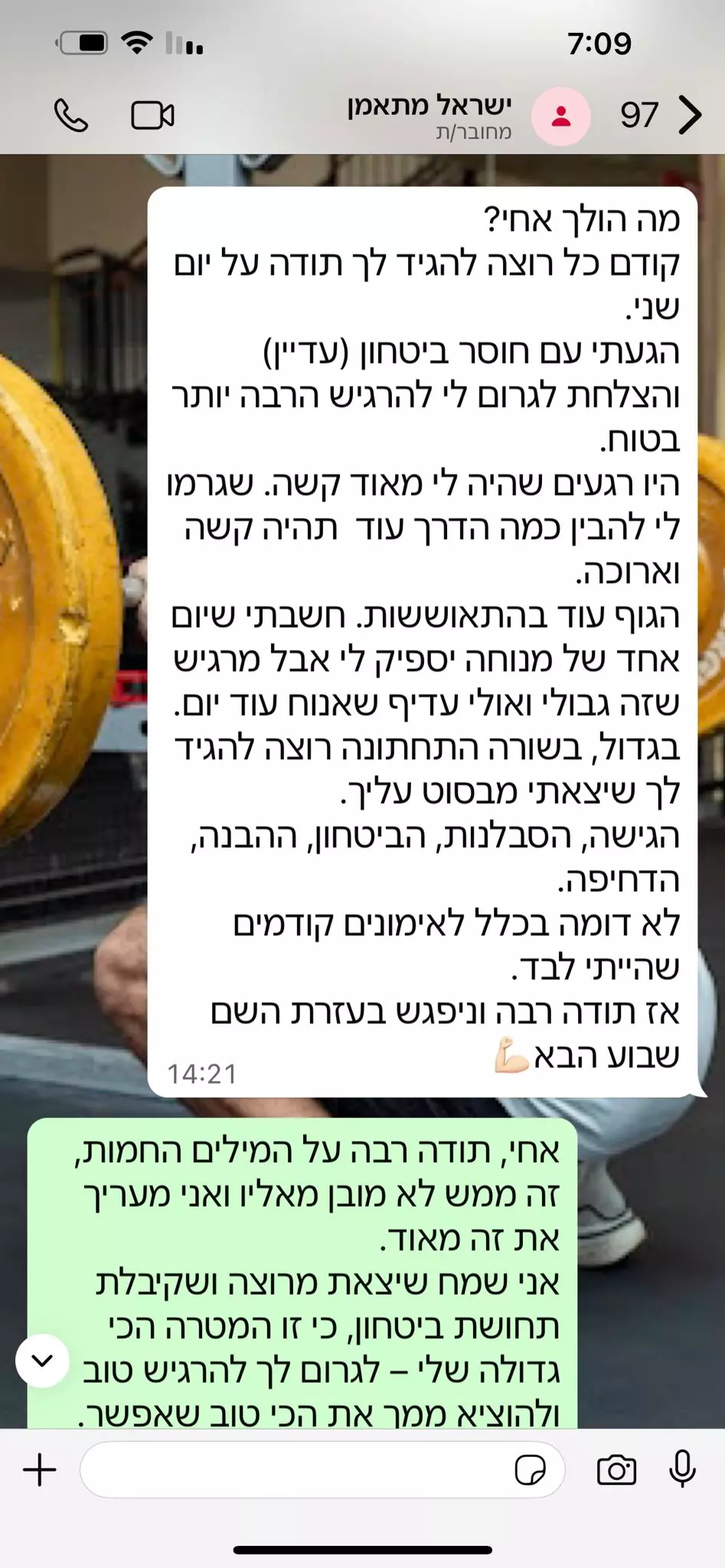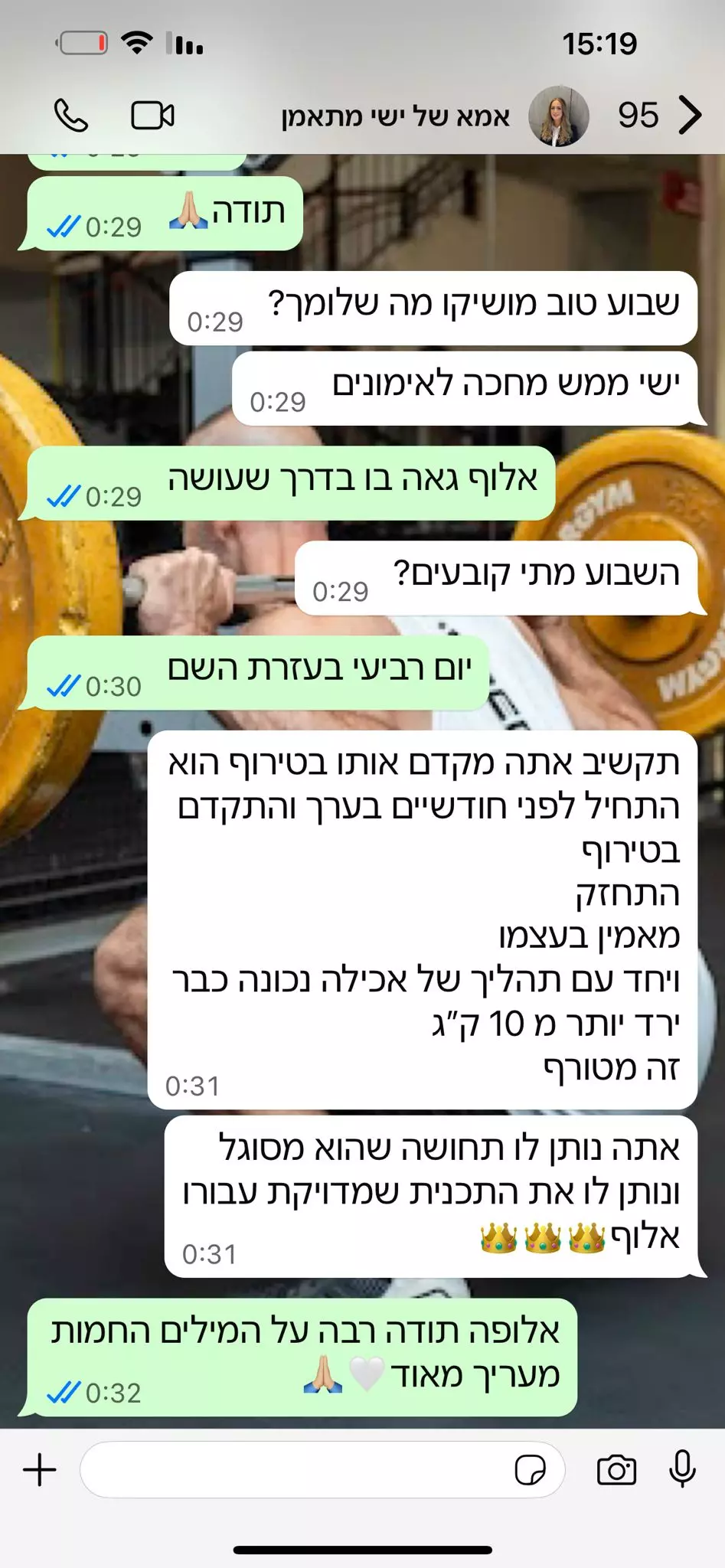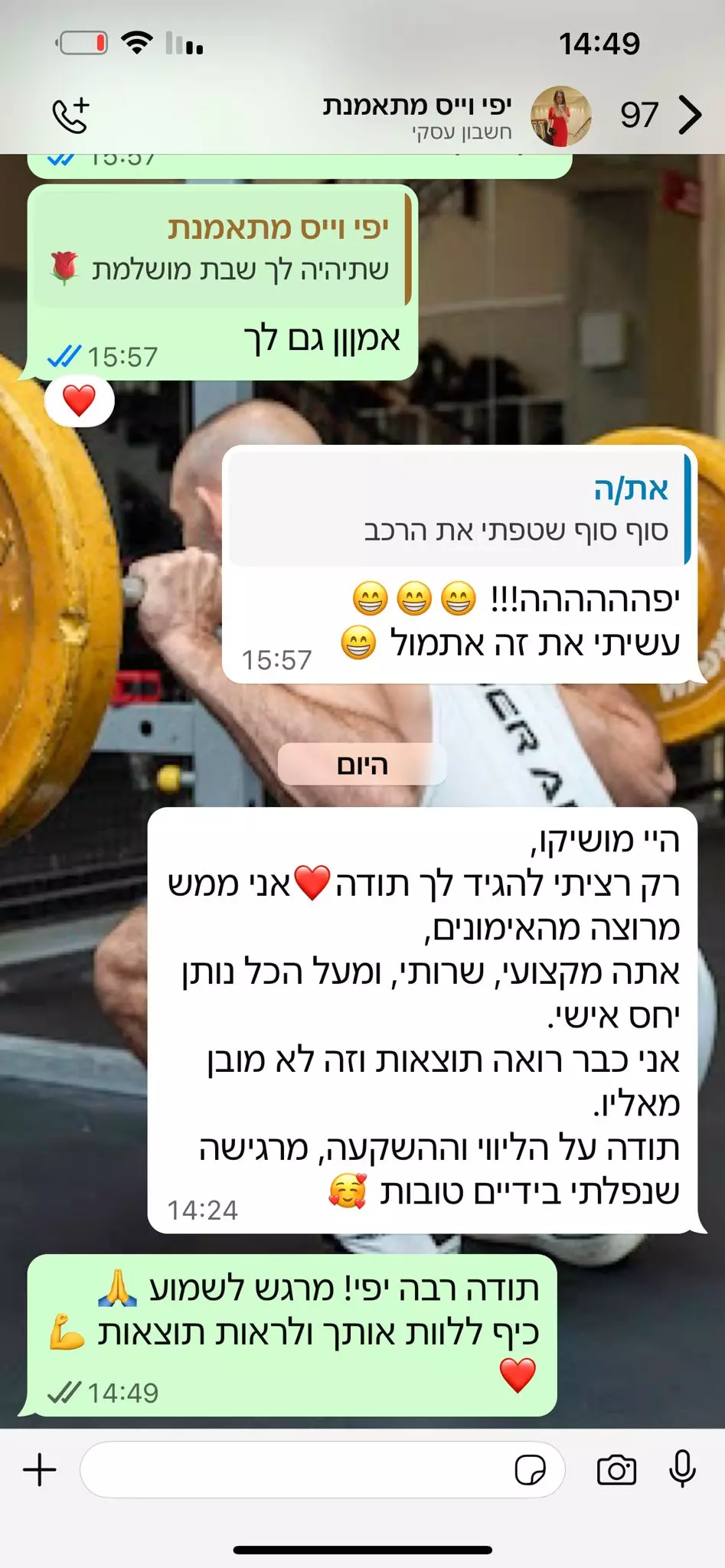 שלום, שמי משה ג׳רבי ואני מאמן כושר אישי עם ניסיון של מספר שנים בתחום הכושר והבריאות. במהלך השנים עזרתי להרבה אנשים, נשים וגברים כאחד, להשיג את המטרות שלהם – בין אם זה לרדת במשקל, להתחטב, לשפר את הכושר הגופני או לעלות מסת שריר.